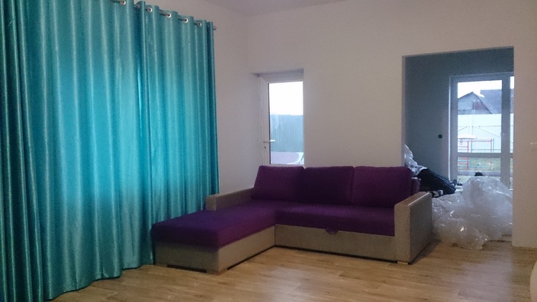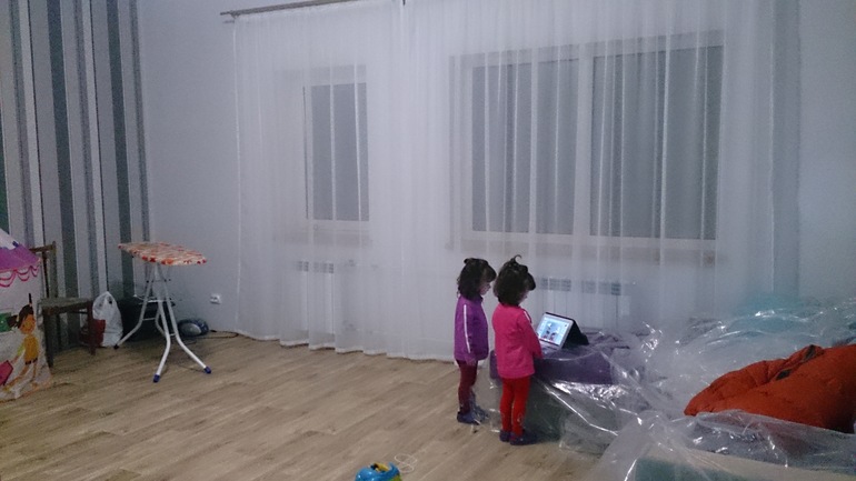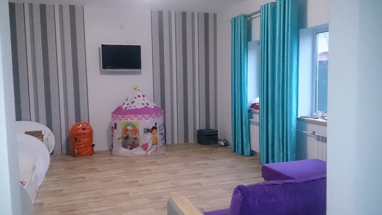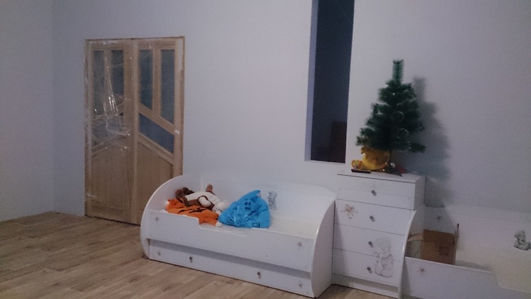Прямо не могу, так расстроилась (((( Комната 4 на 6. Вообще это гостиная, но так как лестница на второй этаж не готова, а я очень хочу переехать в дом,то спать будем все в гостиной. Мы на диване, девочки в кроватках.