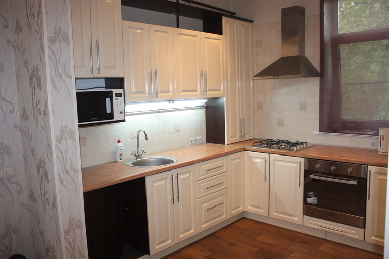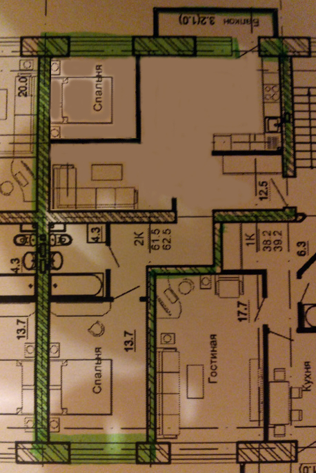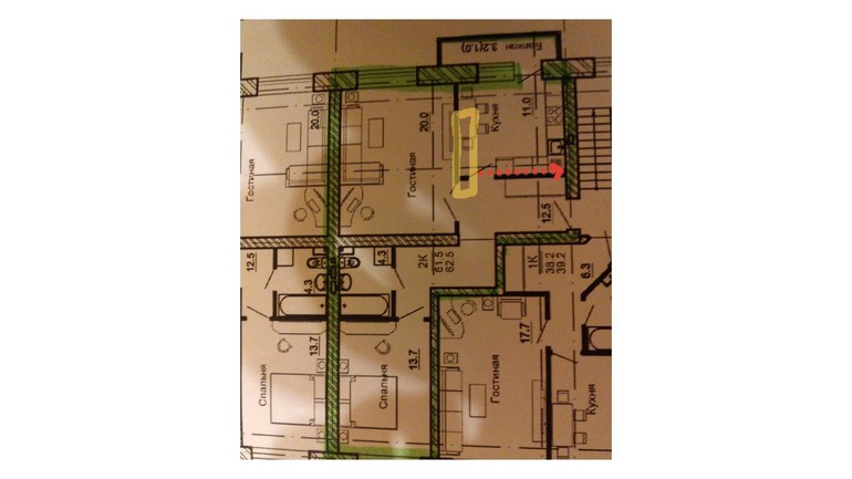 Где желтым отмечено, там ставите кухонный гарнитур, мойку в нижней части.
