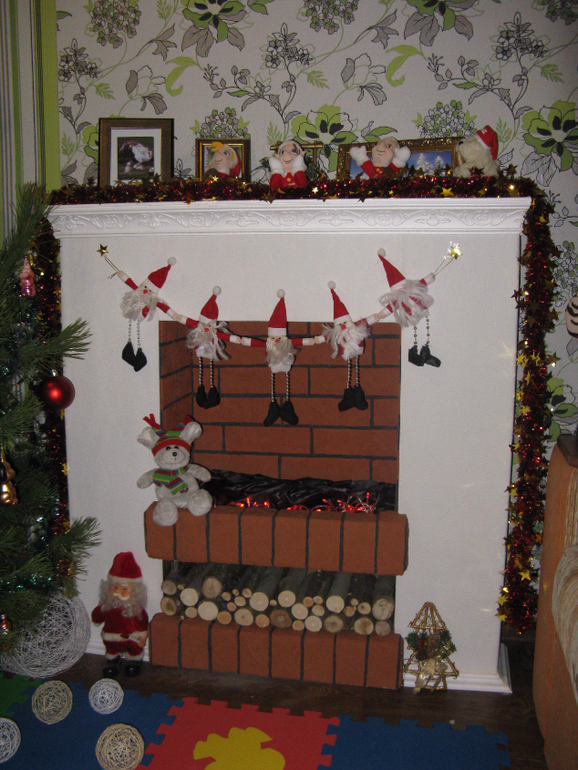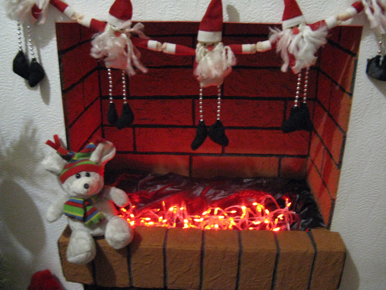 6. Верхнюю переднюю стенку вырезаем из картона (хорошо вымеряем расстояние и вырезаем картон на 5 см больше с обеих сторон, прорезаем в нужном месте картон и сгибаем, как делали кирпичи на полочку, получаем конструкцию похожую на букву П, следим, чтобы стенка была вровень с колоннами и приклеиваем к внутренним стенкам колонн на двусторонний скотч). На этом этапе укладываем гирлянду (покупаем обычную гирлянду, но только с красными лампочками) протягиваем вилку в отверстие, которое мы сделали в полочке и вытягиваем наверх колонны (тоже в отверстие).Теперь ставим наш камин на место, к стенке. Мне муж прикрепил камин к стенке на 2 шурупа (или как они называются с пластиковыми такими штучками, в которые вкручивается шуруп). Сейчас появятся небольшие щели из-за неровности пола, стенки или коробки :) если щель появилась внизу, то подложите небольшие полоски картона, позже эти погрешности видно не будет.