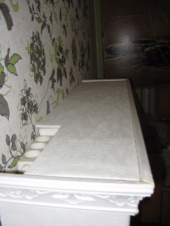 8. Приклеиваем багет: вниз узкий, формируем из него углы и приклеиваем к камину, на верх широкий (он должен быть чуть-чуть выше уровня камина). Вымеряем верх камина, вырезаем из картона "крышку" (2 шт) склеиваем между собой и обклеиваем обоями. Внимание: эта крышка не должна опираться на багет (хорошо вымеряйте, чтобы растояние до багета было пару миллиметров), крышка должна опираться на пенопласт! Возможно вам понадобится ещё один слой картона.