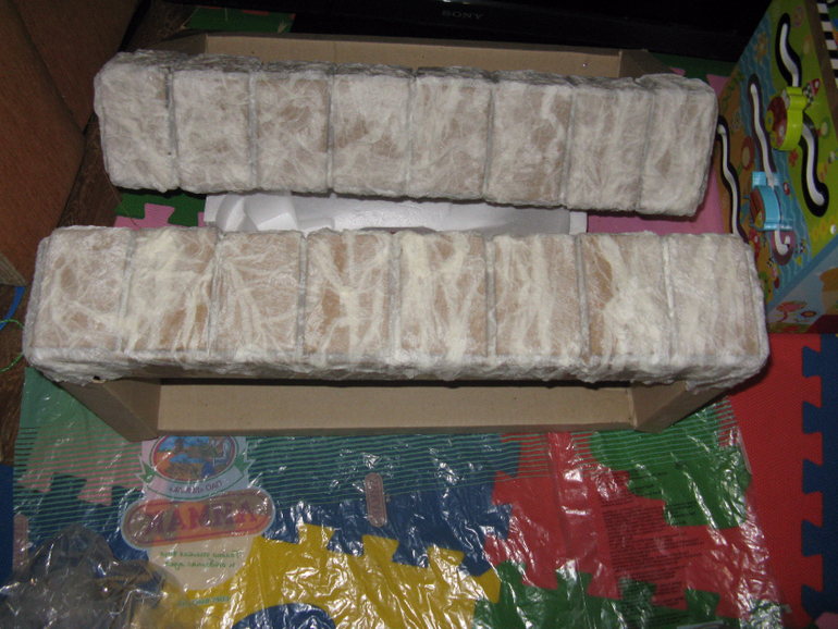 2. Я хотела купить обои с рисунком кирпичей, но не нашла подходящие (чему сейчас очень рада), поэтому стала "лепить" кирпичи сама. Вырезаем из картона кирпичи (посмотрите на фото как должны быть рёбра жесткости картона, это важно) вымеряем "полочку" и в нужных местах разрезаем картон напополам, чтобы он легко и ровно согнулся (смотрите фото). На верхней "полочке" кирпичики должны заходить под низ полки, на нижней нет. Приклеиваем кирпичики на двусторонний скотч. Также приклеиваем сбоку кирпичик (сначала измеряем насколько полочка выступает от колонн).