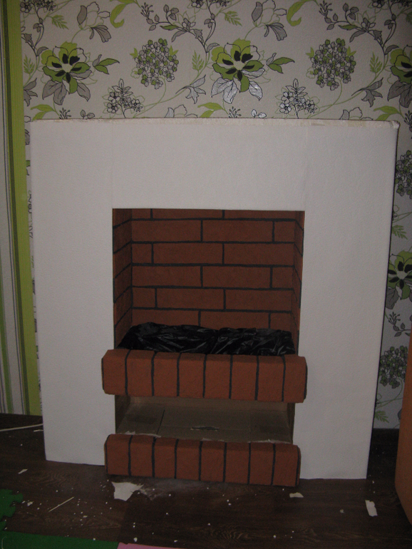 5. Мои коробочки, которые я не знаю откуда :) , были с одной стороны ровные, с другой с углублением (вы видели это на фото), нижнюю я положила ровной стороной вверх, а верхнюю, верх углублением. Это углубление я задекорировала черной тканью (вырезала прямоугольник, размером больше чем полочка и прикрепила края к наружным (которые не видно) стенкам полочки, а спереди прикрепила к внутренней стенке на двусторонний скотч (под кирпичики, поэтому делала их на сантиметр больше, как бы над углублением). Ещё я вырезала в одном боку этой коробки дырку, чтобы прошла розетка. Собираем наш камин (колонны, полочки, заднюю стенку) воедино. Приступаем к покраске кладки. Для этого нам нужна водоэмульсионная краска, колер (персиковый и черный). Наливаем в отдельную баночку краску и смешиваем с колерами (я налила почти полную жестяную баночку от кукурузы, туда вылили весь персиковый колер и примерно четверть черного) всё перемешиваем и красим наши кирпичи. Краска быстро высыхает, проверяем со всех сторон, полностью ли прокрашена кладка (мне пришлось подкрашивать раз 5 наверно). Кирпичи высохли, рисуем цемент (тоненькой кисточкой). Для этого смешиваем краску с черным колером, должен получиться тёмно-серый цвет.