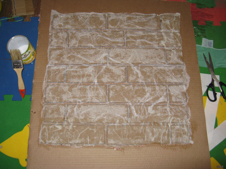 4. Берём обычные салфетки, клей ПВА и кисточку. Разводим клей с водой (не сильно) и обильно намазываем нашу кладку из кирпичей, салфетку разворачиваем, мнём в руках и, чуть расправив, прикладываем к кладке, кисточкой, смазанной в разведённом клее, аккуратно "причмякиваем" салфетку к кладке и не забываем "прорисовывать" расстояние между кирпичами (типа цемент). При этом способе мы получим фактуру камня. Оставляем всё это дело сохнуть на сутки примерно.
