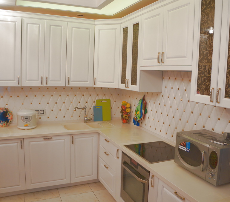 Я бы тоже фартук изменила на плитку выпуклым ромбом производства ЗИН СУ 20х10 см с золотыми вставками, она не дорогая. но сразу же добавила бы уют, пышность, и богатый стиль.