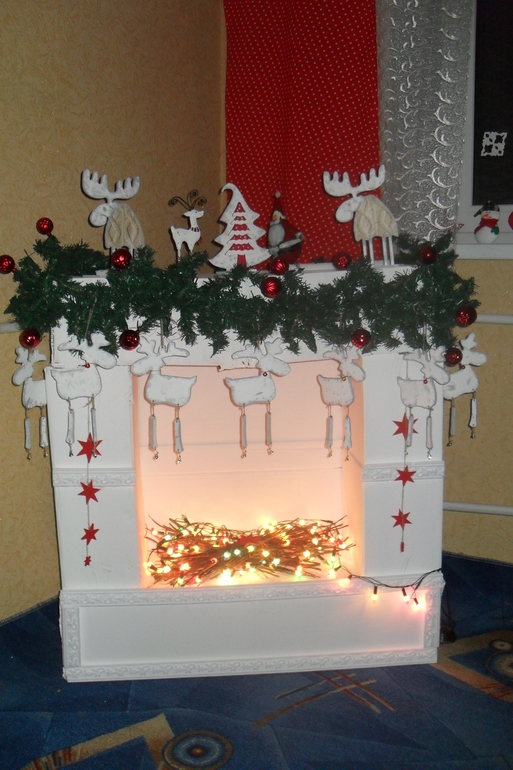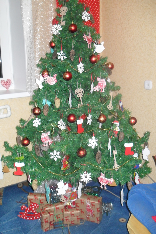 Подготовка дома к праздникам.По нашей семейной традиции нарядили ёлочку и интерьер к Новому году,25 декабря. Ёлочку украсили деревянными игрушками(раскрасили с ребятишками),шишками(собрали осенью) и игрушками из картона(тоже совместное производство с детками) +стеклянные шары. Игрушки ,к-ые шили в прошлом году с сыном,пустили на украшение интерьера.И главное украшение-камин из коробок.
