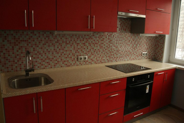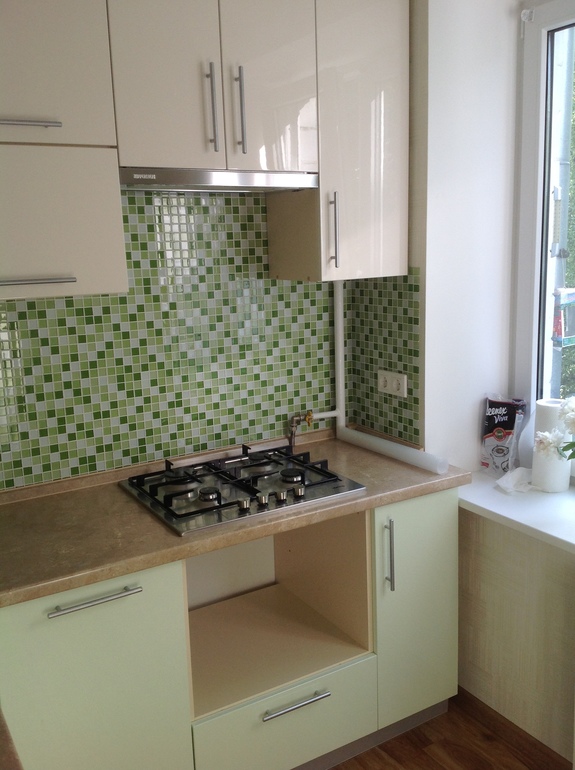 Ну меня уже во второй квартире фартук на кухне из мозаики. В старой квартире был в бежево-коричневых тонах под камень. Сейчас сделали бирюзовый. В уходе нет проблем, выглядит, на мой взгляд, лучше панелей и скинали, и не так избито как кабанчик.