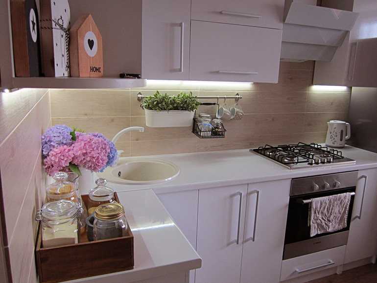 Интерьерное решение маленькой кухниВсем привет! Планируется у меня кухня, белый глянец, столешница по цвету - тростник. И вот вбила я себе в голову, что мне обязательно нужны икеевские черные рейлинги и всякие причиндалы к ним. Хочу, не могу!!! И черные ручки на фасадах, если не найду в городе, закажу тоже из Икеи. Теперь моя заморочка: мне кажется, ко всему этому как-то не очень подходят мойка и смеситель из нержавейки. Думала насчет моек из иск. камня, только в белом или каком-то бежевом оттенке. И смеситель в тон. Но очень уж я боюсь их брать, начиталась уже, что может треснуть и т.д. и т.п...Поэтому, наверное, все-таки нержавейка. Еще очень нравятся ручки под бронзу, но тогда получается вообще мешанина: ручки под бронзу, рейлинги черные, раковина и смеситель из нержавейки... Или я заморачиваюсь???? У кого как? за фото буду особенно благодарна!!! И еще не будет ли обилие черных деталей вычурно на маленькой кухне (6 кв.м.)? Очень-очень жду советов!!!!