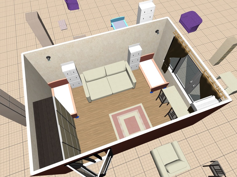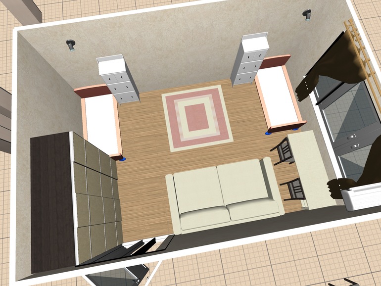а диван у вас 2м?может диван на стену 3,5м а по бокам 2 шкафа по 80см?и кровати-одна по одной длинной стене а другая напротив по другой стене.