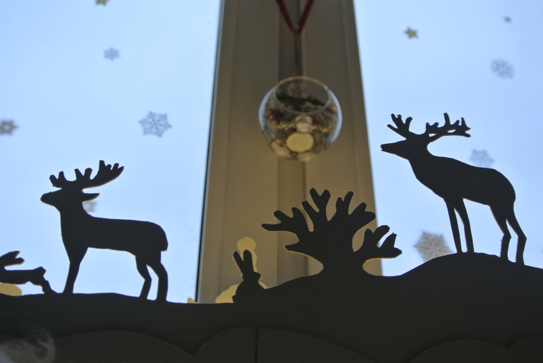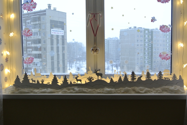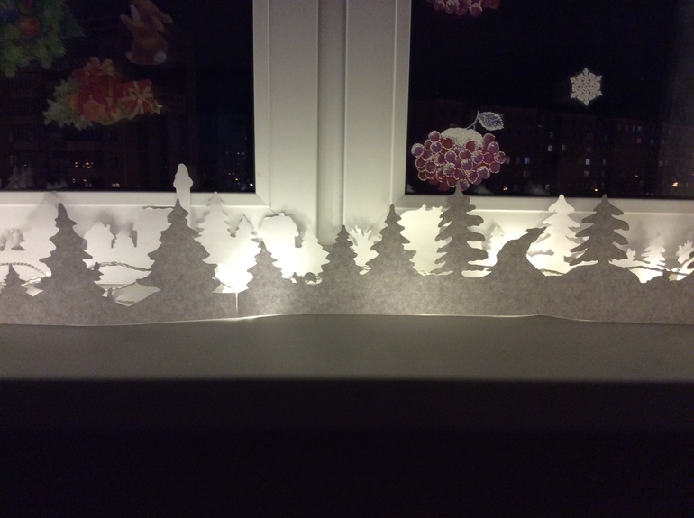 Елку мы пока не поставили, а вот окно украсили.