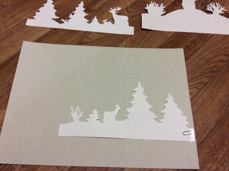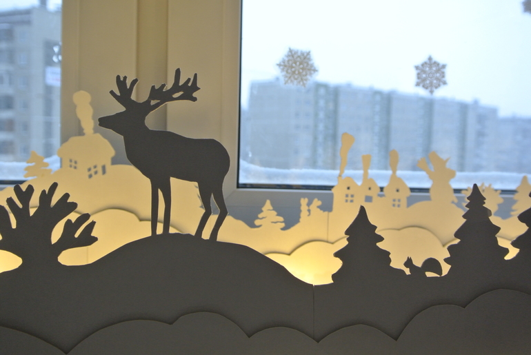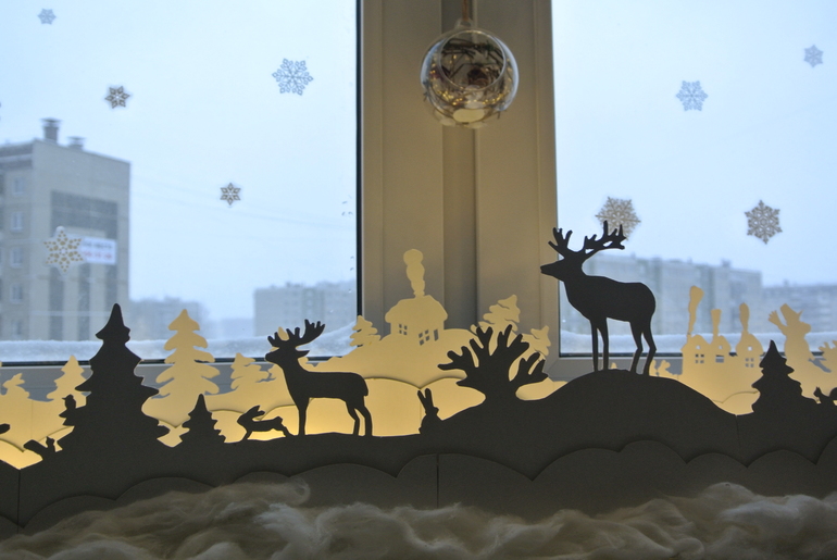 Потом перенесла их на картон. Далее - весьма физически непростое вырезание канцелярским ножом, стыковка всех деталей и установка на подоконник.