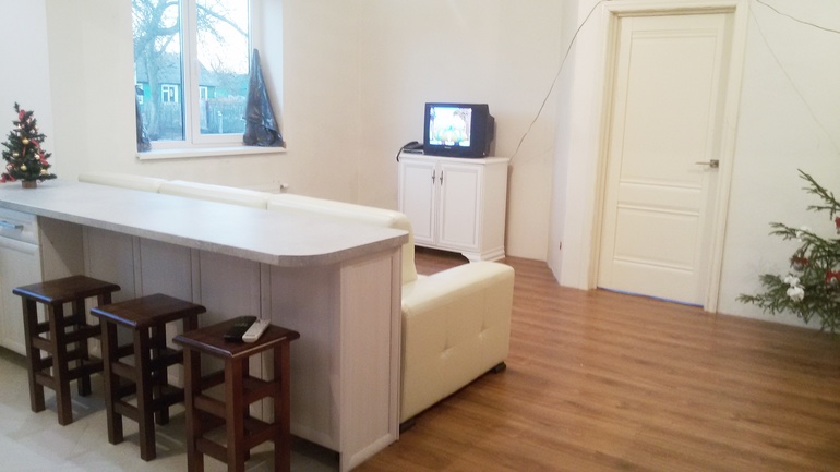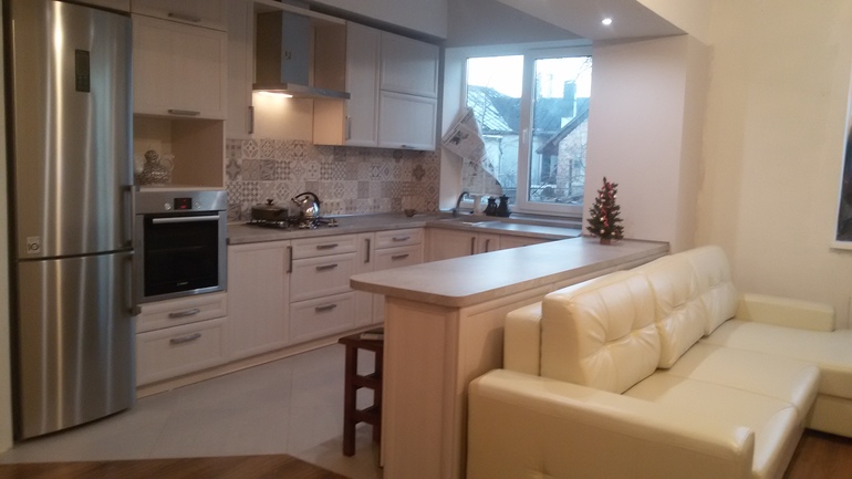 В общем ситуация такая. Имеется кухня-гостиная- без обоев, штор и декора, галогенки на балке - временные, светильники потом подберем