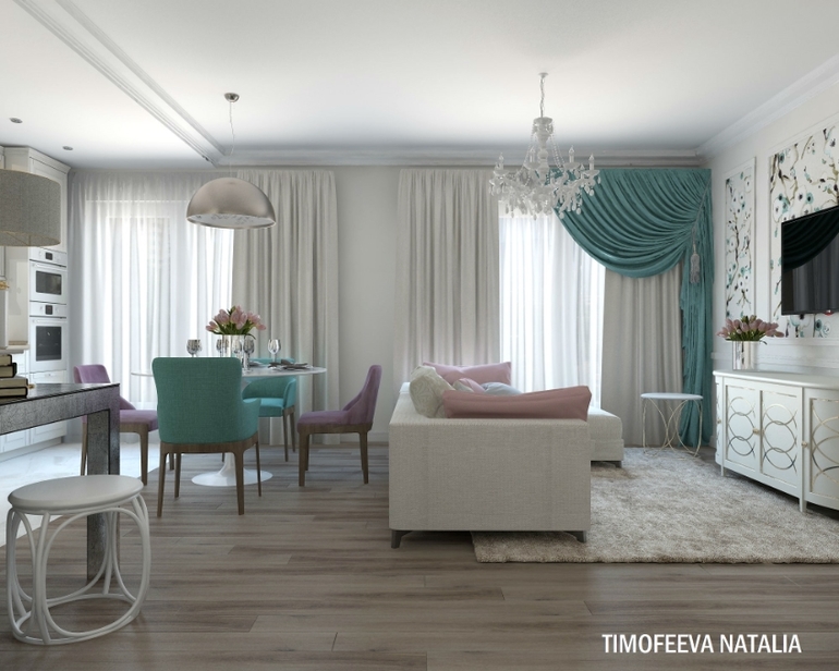 И еще заодно посоветуйте с цветом штор. Очень понравилась визуализация одного из дизайнеров в этом сообществе, покажу фото, тоже есть задумка - шторы сделать однотонными с обоями и + добавить бирюзу или светло-голубой (планирую на табуреты сшить мягкие сидушки бирюзового цвета, еще чайник такой же, к примеру, и римскую на кухню с бирюзовыми полосками) как думаете, не будет лишним этот цвет? Вот фото штор
