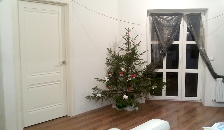Хочу всю эту стену напротив кухни - обои с классическим рисунком, а стену с окном и с французской дверью - однотонные компаньоны, вот стена с фр. дверью (страшноватая елка тоже временная )))):