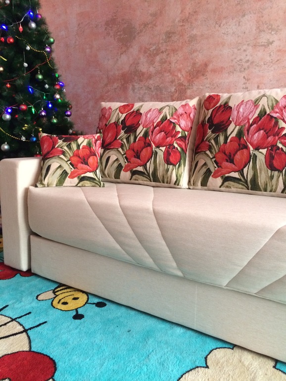 у меня у мамы такой же как на Вашем фото серый, только у нее цвет кофейный. Очень удобный диван, в т.ч. для сна. Серый-универсальный, оттенить м.б. любым цветом подушек,каким захотите. А тюльпаны хороши, конечно, но обязывают. Хотя мне тоже очень нравятся.