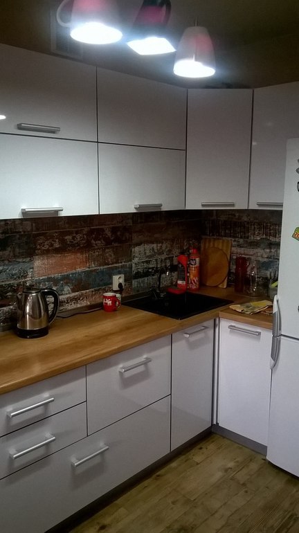 Очень красивая у вас кухня 👍тоже с углом хотела, но потом решили прямую. А на стене это панель? Мне муж предлагает белый пластик из цветов лотоса туда. И столешку под дерево хотим.