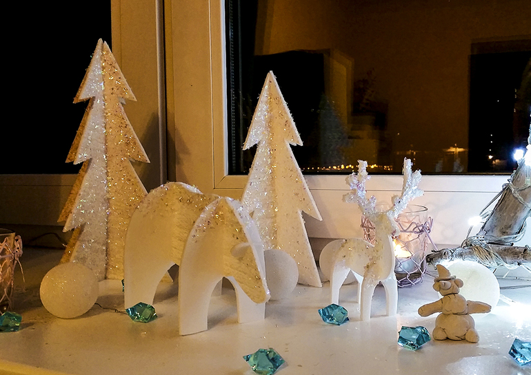 Лосиков, медведя и оленя с елочками мы сделали из пенопласта. Снеговиков дети слепили из глины.