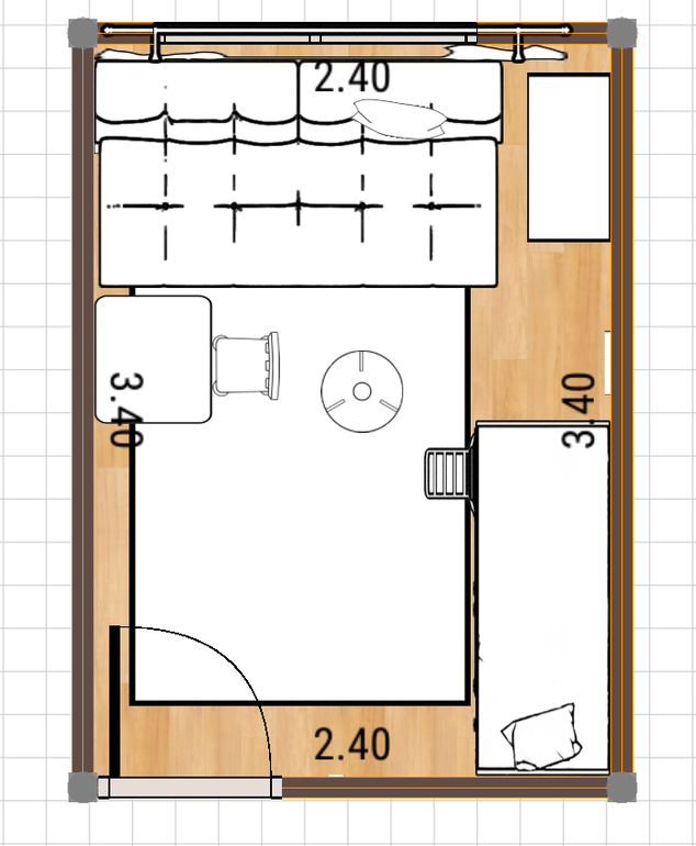 Что имеем... комната 2.40м на 3.40. Стены крашенные, батарея под окном спрятана. Подоконник шириной около 45см. Пол ламинат. До лета в эту комнату переедет диван клик-кляк бежевого цвета. На схеме он изображен в максимальном сложении.