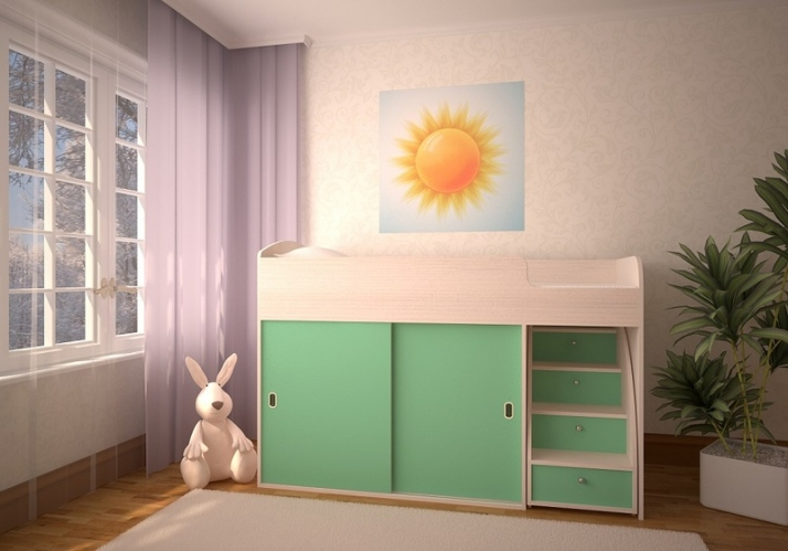 Цвет будет под стеллаж. Чердак можно сделать на заказ любой высоты: планирую спальное место на высоте 80 см, а внизу шторками загородить игровую зону. И если остановлюсь на нем, тогда возьму не такой резной. Огромный плюс чердака и последней кроватки, что это массив сосны. А мини чердак зеленый интересен своим видом.