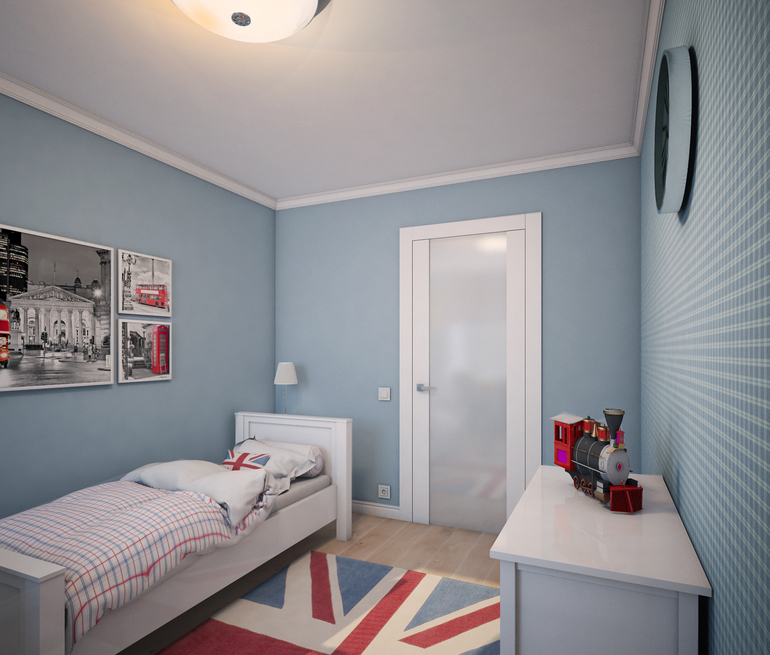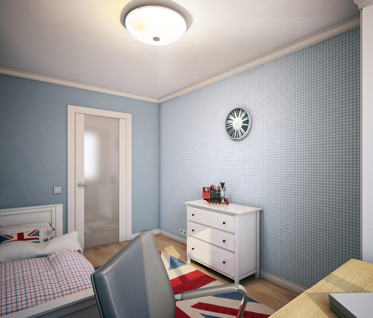 В детской отвоевала наличие хоть какого-то цвета. Сначала предлагала бежевый, но утвердили с голубыми стенами.