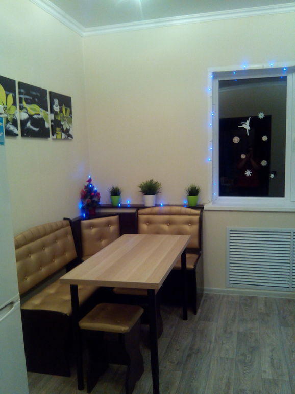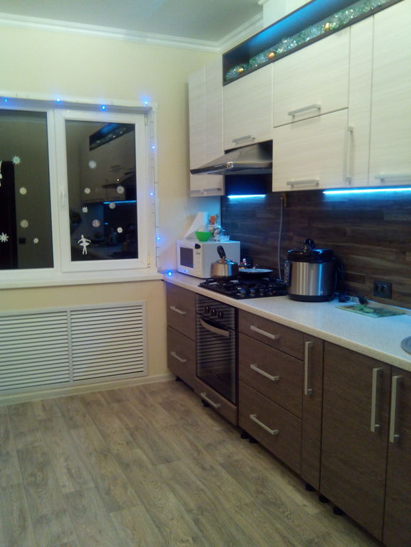 Кухню муж сам делал,материал закупал в боярде и частично в затоне.Вышло намного дешевле .На стенах обои в леруа брали,рисунок как вязка лицевыми петлями.