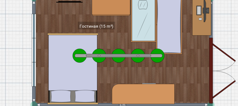 В планировщике не удалось вставить прикроватные тумбы с каждой стороны родительской кровати. Та кровать что на картинке стоит рядом с детской - это манеж. В длину комната 5м 20см, ширина 3м 5см. Длина шкафа 2м 20см, ширина кровати 150см(спальное место 140см). Телевизо висит на кронштейне. Буду очень благодарна за помощь!