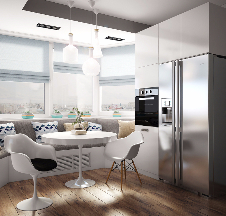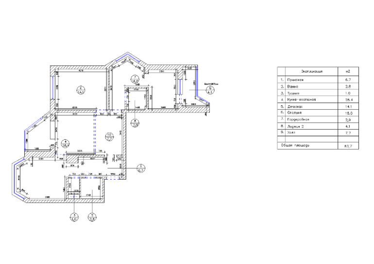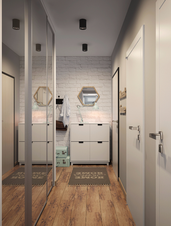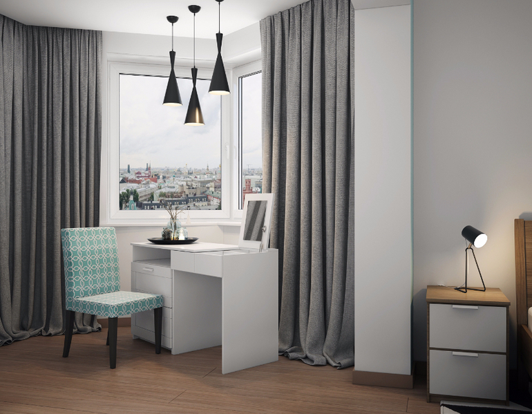 Итак, 3-х комнатная квартира 84м2. Проживать будут трое (мама, папа, маленький сыночек). Лоджию в гостиной решено присоединить и сделать на подоконники рабочий стол для ноута. Лоджии в спальне утепляем, но не присоединяем, там будет место для собаки. В спальне монтируем гардеробную комнату. В эркере ставим туалетный столик.