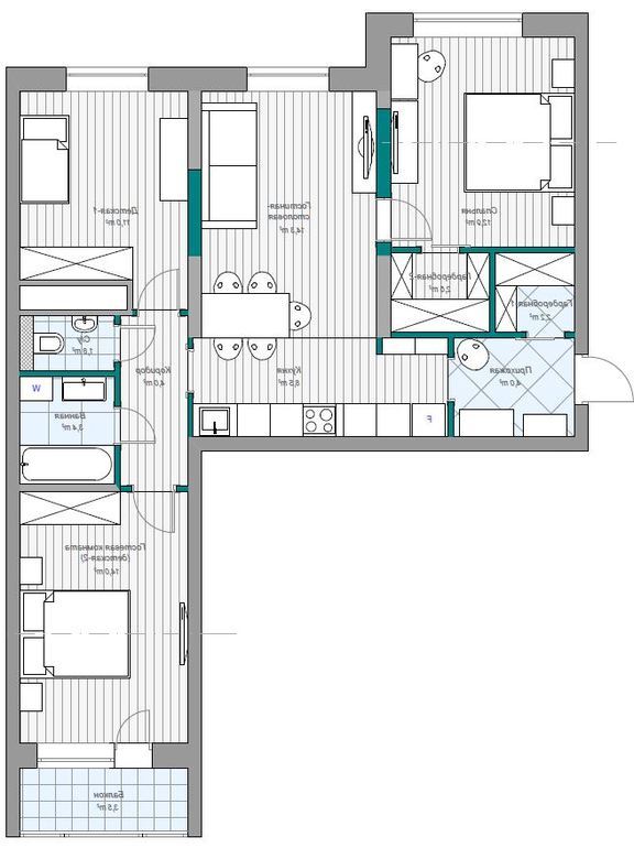Кухню-гостинную(забрав половину большой комнаты), у детей комнаты рядом, Ваша-отдельно и все с окнами...