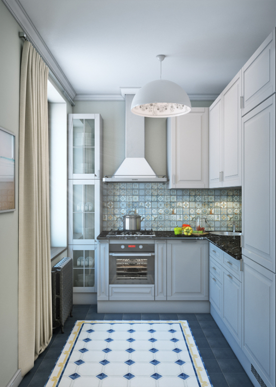 Кухня выполнена в нежных пастельных тонах. Фартук выложенной плиткой в технике пэчворк(по технике лоскутного шитья).
