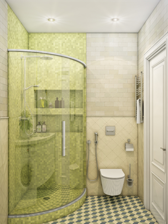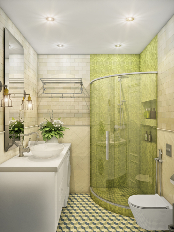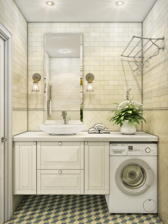 В ванной комнате расположилась длинная столешница из искусственного камня, под которой разместился шкаф и стиральная машина. По желания хозяев, ванна была заменена на душевую кабину. Стены украшает плитка фабрики Cevica, на полу плитка с геометричным рисунком фабрики Vives.