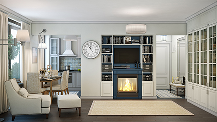Цветовым акцентом спальни стало изголовье кровати, выполненное в дымчато-синем цвете, который еще встречается в других пространствах. Например, в гостиной, где центром пространства стал камин того же цвета. А также пол в кухне и в прихожей выложен плиткой Serenissima&Cir, где основная фоновая плитка так же синяя.