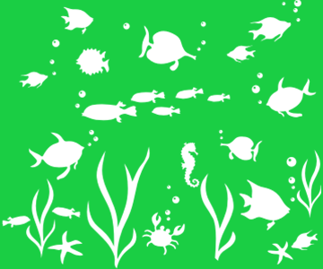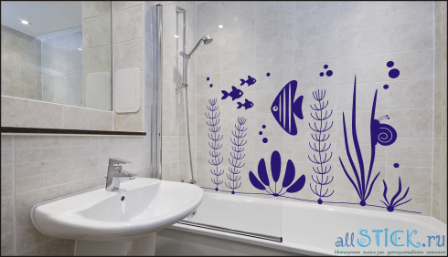Я б просто взяла белую краску моющуюся литр и нарисовала силуэты рыб и гадов на синем фоне
