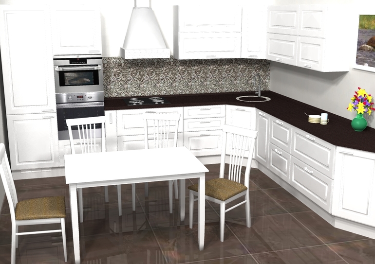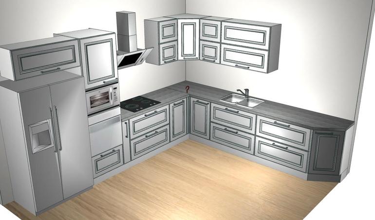 Имеем кухню 15,3. Гарнитур будет стоять углом по размерам стен 380х327. Рисовали сначала так: