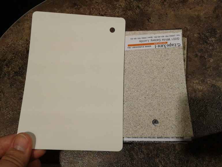 Покритикуйте, пожалуйста, или посоветуйте,что изменить.Фасады эмаль белая, столешница песочного цвета с блестками.