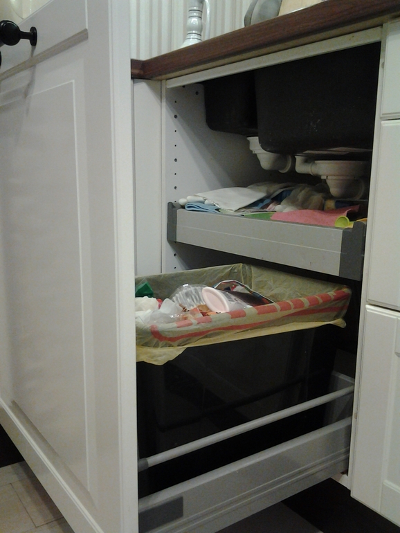 На мой взгляд, оптимальное размещение мусорки, это вот такое - спина скажет спасибо, а кухня это прежде всего инструмент. В Вашей компоновке так не сделать.