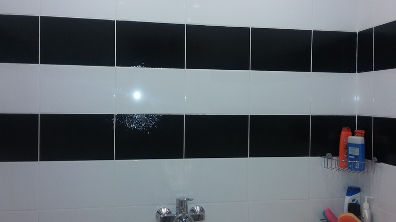 У нас вся белая и две горизонтальных черных полосы (центр белой полоски на уровне глаз). Плюсы: с помощью цвета аксов можно каждый год обновлять с/у - то зеленый, то красный, то голубой и т.д. Или можно сделать полоски вашего любимого цвета. Смотрится современно, мне так гораздо больше нравится, чем с панно цветочками т.д. И да, ни в коем случае не делайте датчики движения, а то ни на унитазе спокойно не посидишь, ни в ванне спокойно не полежишь