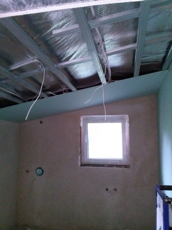 У нас тоже этот потолок с наклоном. То есть в спальнях получилось сделать ровный-хватило высоты, а в коридоре он уже с наклоном. Все так же с металлоконструкциями обшивали гипсом. Вот тут вот ванная комната- виден как раз скат хорошо.