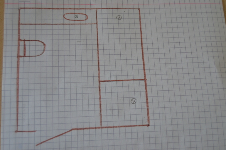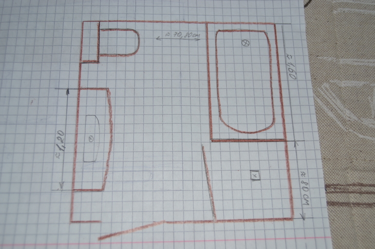У меня 7 кв. Вот так размещено. Тут визуализация и то что есть. Душ еще не оборудован. Умывальника тоже пока нет. как раз и фото и картинка -взгляд от входа.душ -метр на метр, ванна 175×100 см.