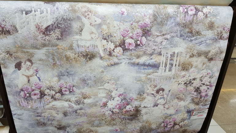 Необычные обои. Поклеила бы всю стену, а не квадрат. Остальные стены, в зависимости какие цвета вы любите-холодные или теплые. Можно подобрать нежно-пастельно сиреневый, голубой, лиловый, кремовый, топленое молоко, жемчужный. В общем все цвета, которые есть на этих обоях.