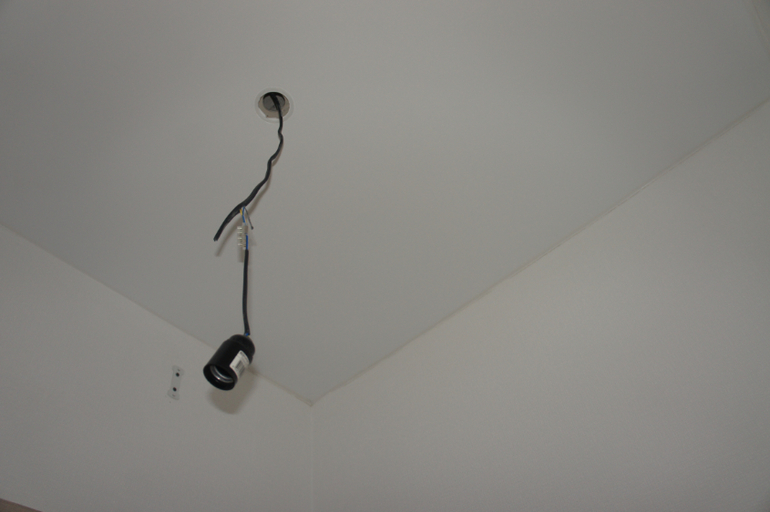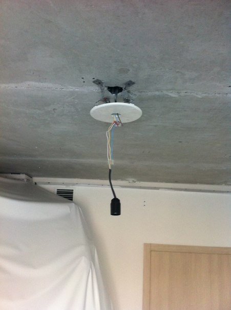 На месте люстры нам делали специальную деревянную площадку на которую крепилась люстра. В квартире нет ни одного крюка под люстру. Если видно там 2 болта (их конечно 4, но лучше не получается сфотографировать).
