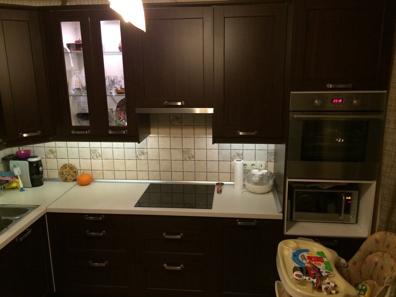 Мне низ не оч нравится, видите шкафчики по бокам от плиты? Они вообще-то одинаковые. Но правый мы почему-то закрыли дверью, а надо было ящики делать и получилось бы совсем красивенько, симметрично. Ну уж как есть))