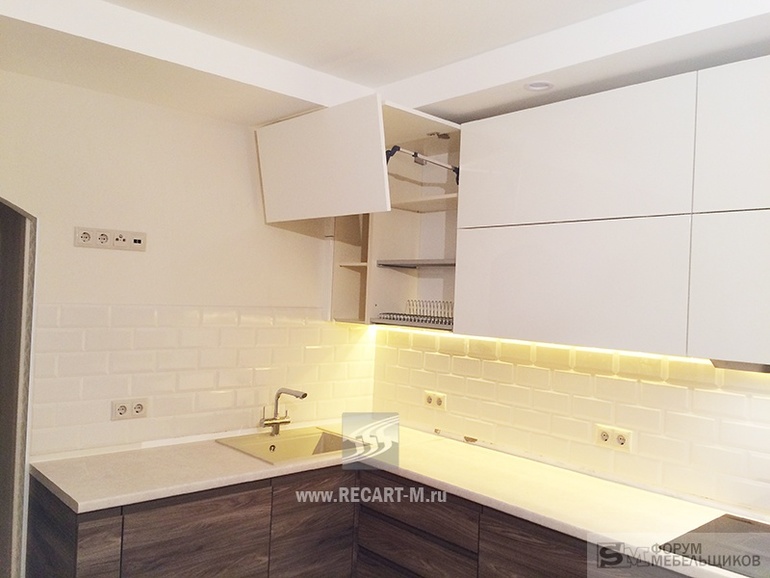 Стильно смотрится! Юля, подскажите, пожалуйста, при таком расположении доступ к шкафчику в углу нормальный? Или дотянуться до самого угла будет сложно (если делать сушку в углу)? И ещё, можно контакты Вашего мастера? Очень качественно кухня выглядит.
