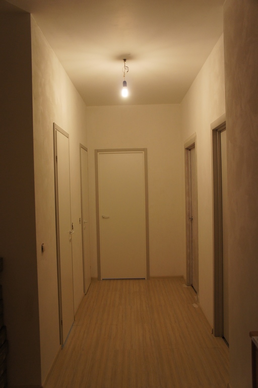 Пока у коридора такой вид (дальняя справа дверь не покрашена, только грунт). Процесс затягивается, потому что надо красить без детей, алкидная эмаль воняет.
