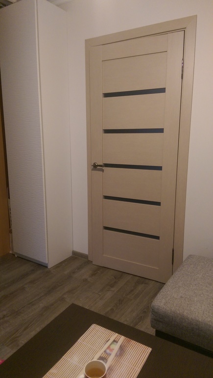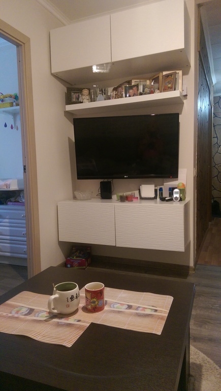 Ой))) История этой комнаты такая. У нас трешка смежно-изолированная. Отдельная маленькая комната и большая смежная с еще одной маленькой. Живем мы с свекром и он живет как раз в маленькой, которая смежная с большой. Ну и никак не желает оттуда перебираться в отдельную. Поэтому пришлось долго фантазировать что делать. Решение было следующим. Отдельную маленькую комнату сделать детской. А большую разделить на спальню для нас и гостиную. Так и сделали. Т.е. наша гостиная 2,5 на 3 метра с тремя дверными проемами)))) вот-другие ракурсы: