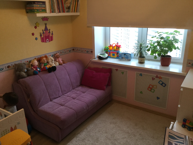 Напротив рабочей зоны диванчик. Многие тут писали, что лучше кресло, диван занимает место.. Возможно. Но я очень довольна этим диваном. Перед сном мы любим прилечь и спокойно почитать минут 20-30. Днем мы раскладываем на диване какие-то игрушки, или я отдыхаю, пока Соня играет самостоятельно. Диван раскладывается в полноценную полуторную кровать, и это выручает, когда я в командировках, а у нас временно живут или свекровь или мама. Ну и если ребенок болеет, и надо асто вставать к ней ночью, то я ложусь в ее комнате.