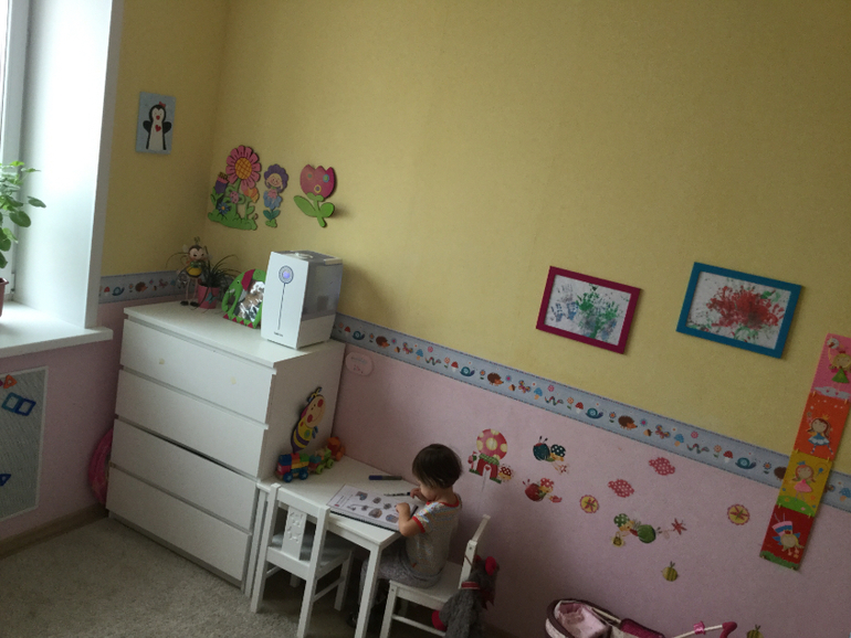 На комоде же стоит увлажнитель воздуха. Очень им довольна, вообще не выключаем. В детской самый комфортный воздух. Рядом же небольшой термометр (самый простой), слежу, чтобы температура была не выше 21-22 градусов...