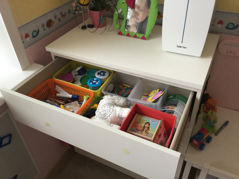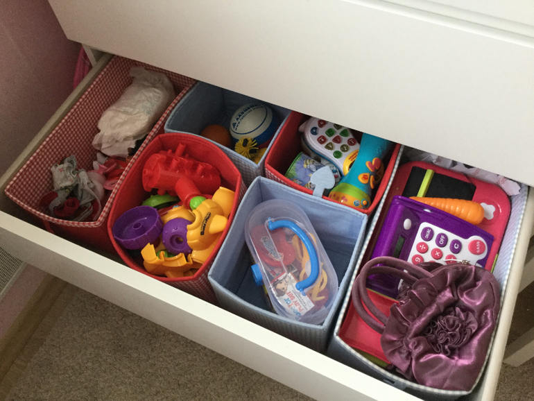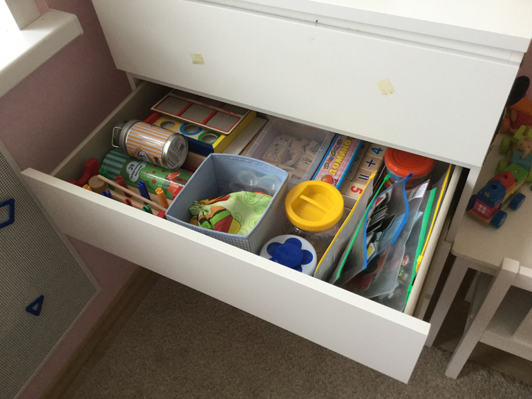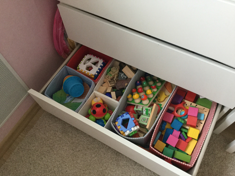 Немного о распределении игрушек в ящиках. В самом верхнем всё для творчества: краски, пластилин, карандаши. Вообще-то нужно его еще немного перебрать...