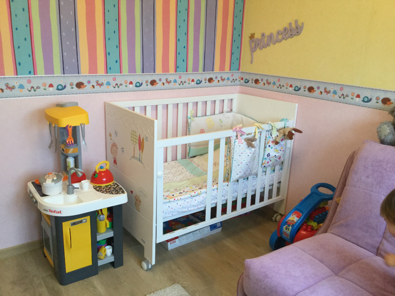 Изначально комната была довольно большой, 16 кв.м., но так как я мечтала о гардеробной, а муж не смог мне, беременной на тот момент, отказать, и так как другого места для нее мы не нашли, то дочери досталось всего 12 кв.м., из которых около 9 кв.м. прямоугольного пространства, остальное ее личный мини-коридор. Из него же дверь в гардеробную, но в ней хранятся вещи только мои и дочери, поэтому мужу подобное распределение неудобств не доставляет...