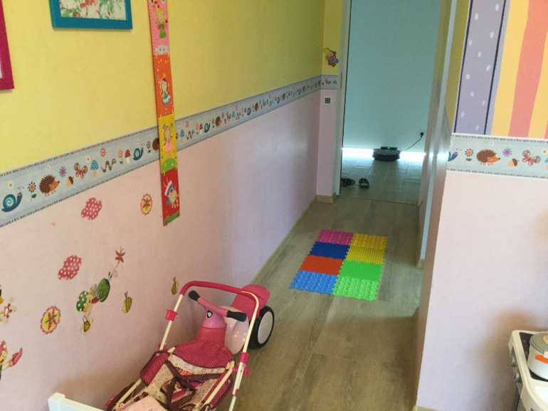 Мини-коридор. Когда дочь была совсем маленькой, активно использовался для ползания. Сейчас там лежат ортопедические коврики, таким образом дочь вынуждена по ним почти постоянно проходить (обойти их она пока не сообразила :-). Тут же паркуем коляску для кукол и беговел. Справа виден проем - это дверь в гардеробную, то есть достать вещи очень легко и быстро, чтобы одеть / переодеть.