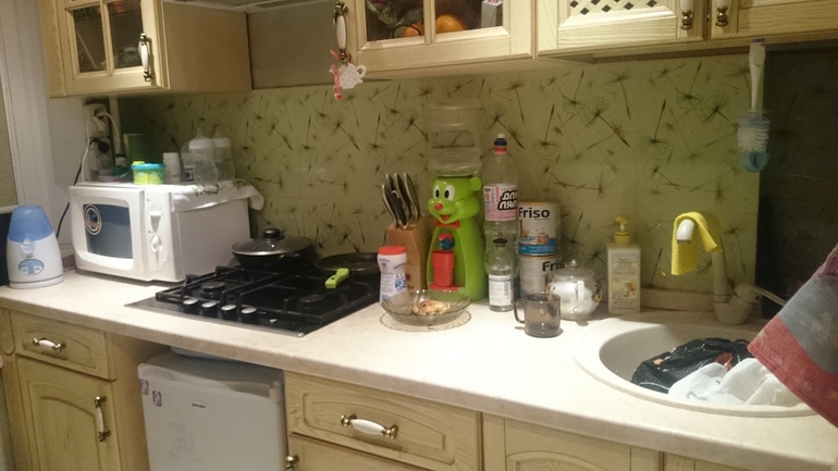 Сейчас у меня бардак, решила выложить нашу кухню внезапно, так что фоткала "как есть". Повторюсь семья большая я, муж, дочь 5лет и сын 5мес. И мои родители, которые сейчас практически живут у нас (по некоторым причинам) уезжают к себе обычно по выходным. А квадратных метров у нас мало... Где-то 30-32.... Позже выложу комнату и покажу как можно расположить 6 человек в однушке))) далее фото по частям верх -середина -низ.)))