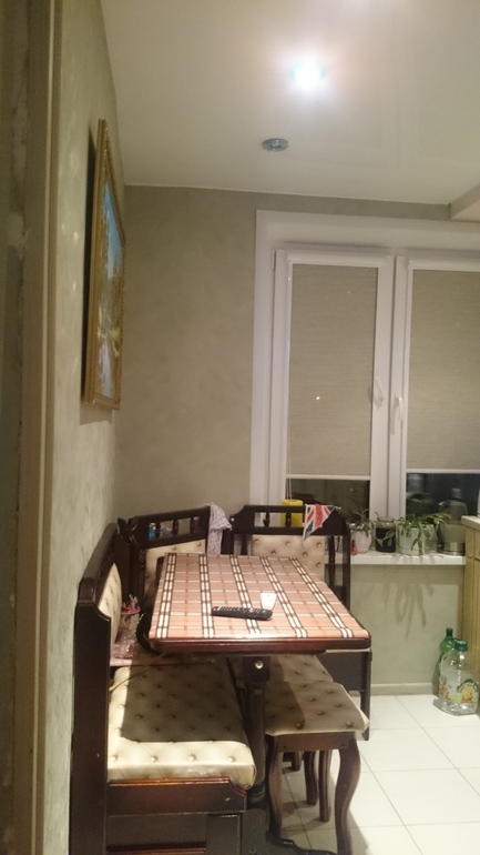 Обеденная зона у нас -уголок. С ним очень компактно, можно задвинуть стол и готовить спокойно))